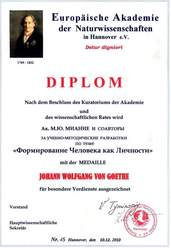 программы Системы по Формированию Личности и их автора академика Миание М.Ю. медалью Иоганна Вольфганга фон Гете. Ноябрь 2010 года.